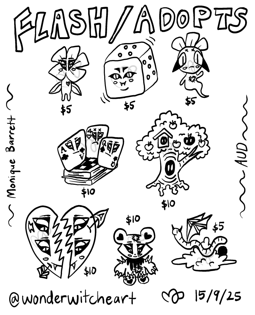 For the first time ever, I’m doing a flash/adopt sheet! If you claim a design, you and only you will be sent the design as a file and be able to do whatever you want with it – get it tattooed, print it as stickers, put it on a shirt, display it, use it as your phone wallpaper or whatever else you can think of. Just as long as you use it for personal use and not try to produce it for or sell it to others. I am also open to orders of making a claimed design into a sticker, card, print, etc. and sending it to you!